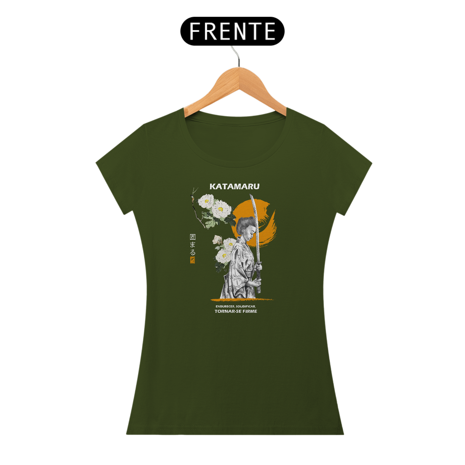 A coleção JAPAN ESSENCE enfatiza os  traços, cores, temáticas e sentimentos da cultura oriental JAPONESA esta camiseta representa o endurecer, tornar-se firme "KATAMURU". A estampa  de uma Samurai (ONNA BUGUEISHA) com uma KATANA é da Designer de moda e Ilustradora Elisete da Silva.